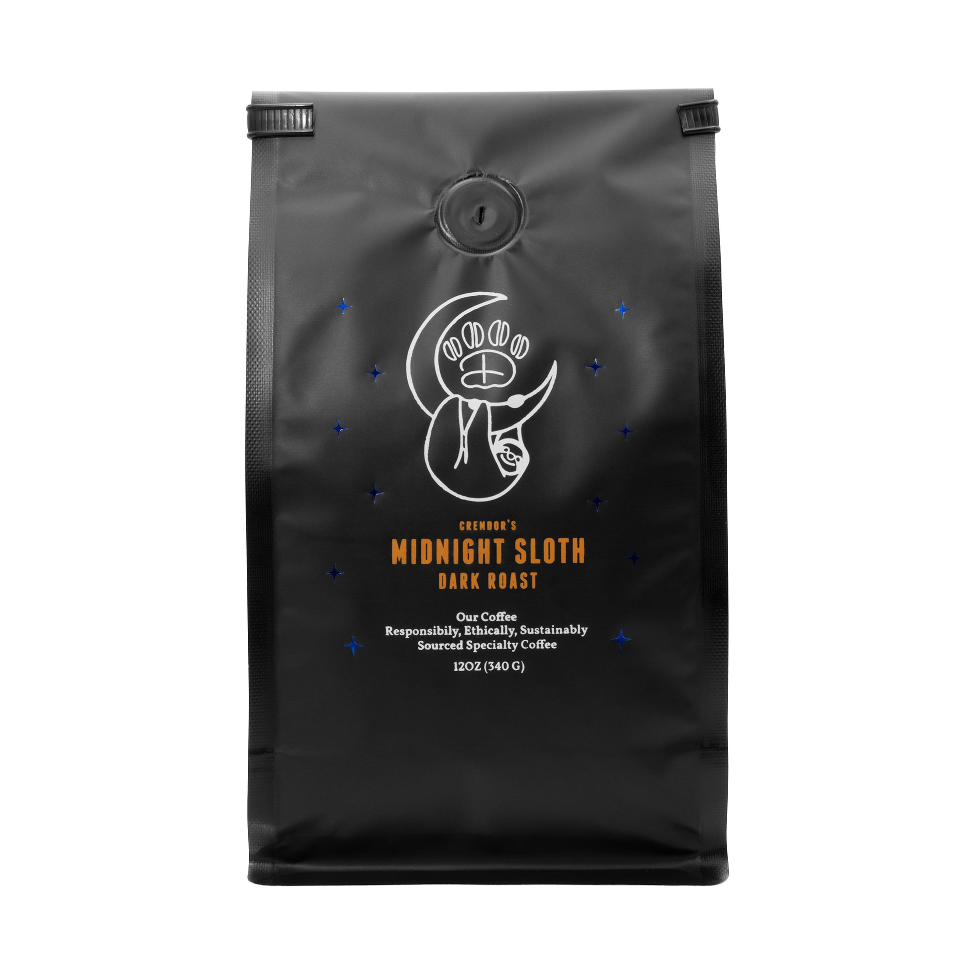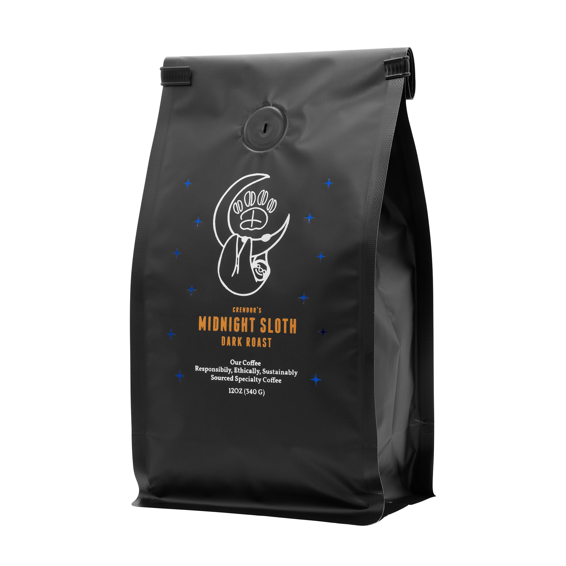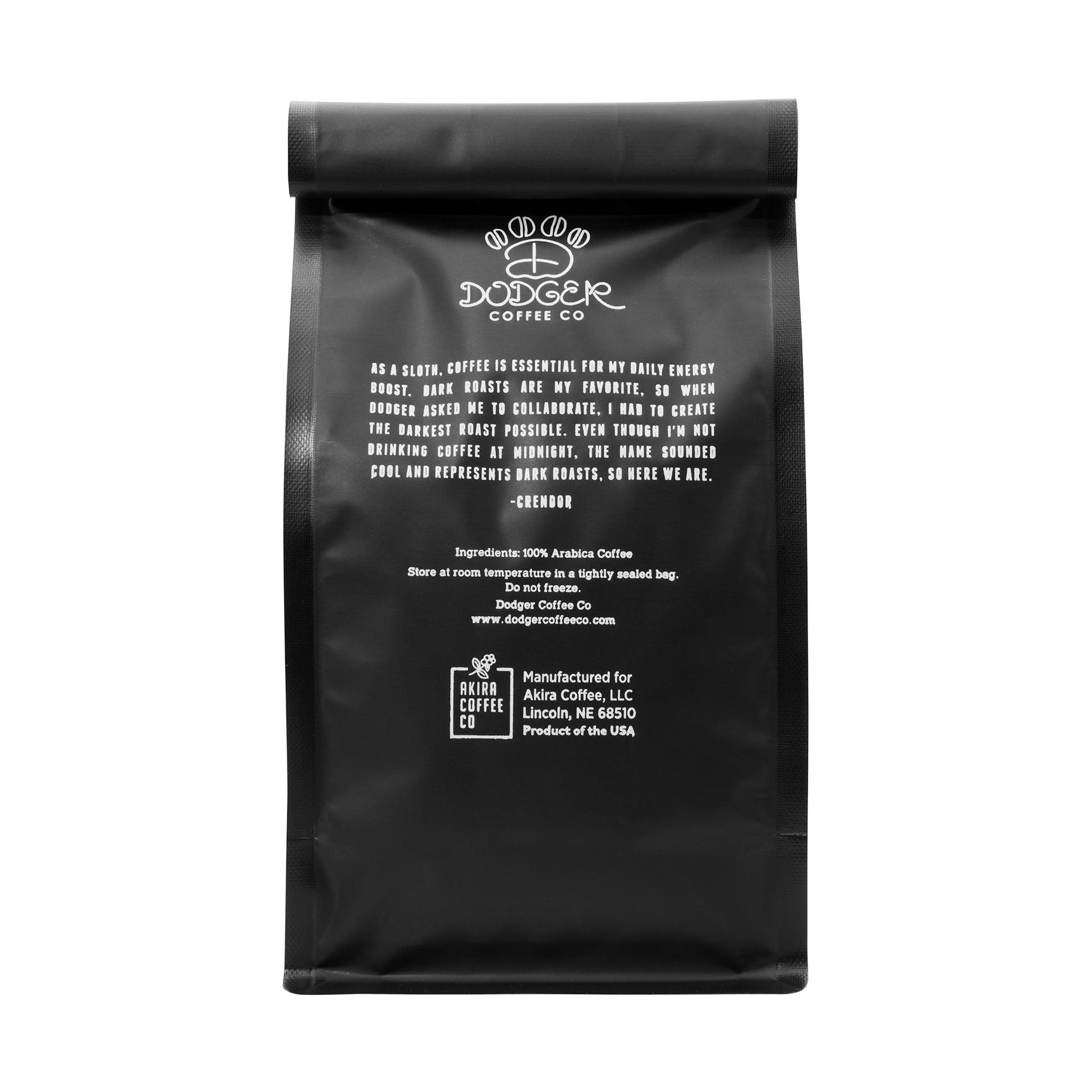 "As a sloth, coffee is essential for my daily energy boost. Dark roasts are my favorite, so when Dodger asked me to collaborate, I had to create the darkest roast possible. Even though I'm not drinking coffee at midnight, the name sounded cool and represents dark roasts, so here we are." -Crendor